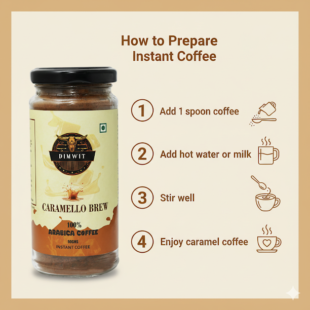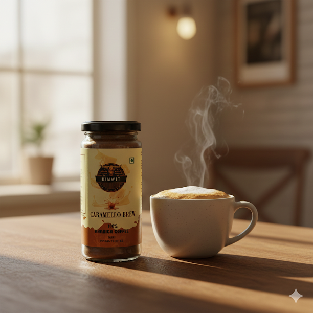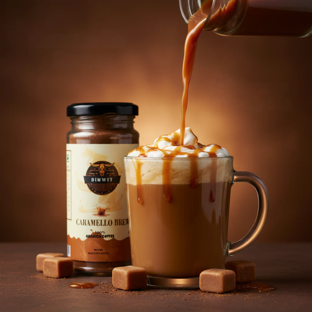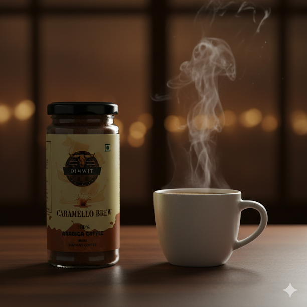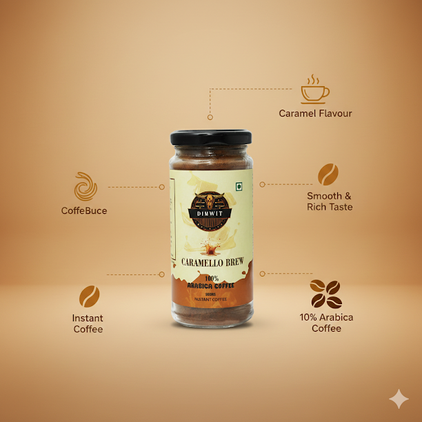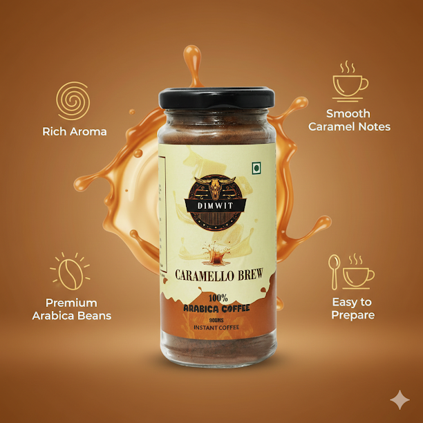 Dimwit Caramello Brew Coffee – A Symphony of Sweet Indulgence Discover the luxurious charm of Dimwit Caramello Brew Coffee, where the bold richness of 100% Arabica beans meets the golden sweetness of smooth caramel. Expertly roasted to perfection, this blend unveils a velvety body with layers of buttery warmth and a lingering, melt-in-your-mouth finish. Every sip is a delicate balance—deep coffee intensity elevated by the silky sweetness of caramel, making it the perfect brew for those who seek indulgence wrapped in elegance. Whether savored as a creamy latte, a bold espresso, or a chilled delight, Caramello Brew Coffee transforms your everyday coffee ritual into a moment of pure decadence. Key Highlights