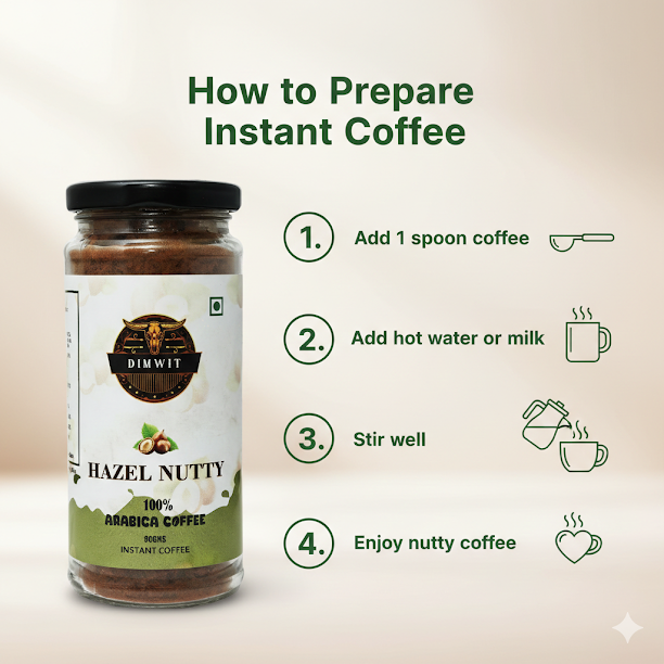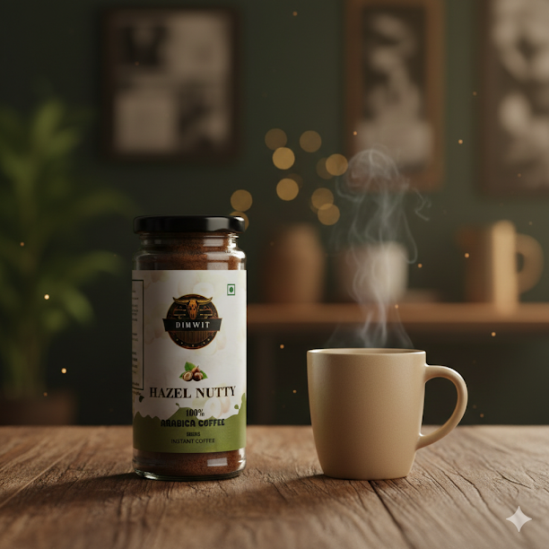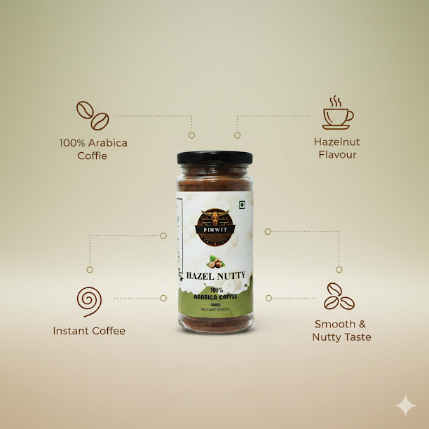 Dimwit Hazel Nutty Instant Coffee – A Nutty Indulgence, Instantly Perfected Elevate your coffee experience with the irresistible charm of Dimwit Hazel Nutty Instant Coffee. Crafted from carefully selected 100% Arabica beans and infused with the rich, toasty essence of hazelnut, this instant brew delivers a luxurious balance of bold coffee character and smooth, nutty sweetness. With every cup, you’ll enjoy the comforting aroma of roasted hazelnuts wrapped around the depth of fine coffee—an indulgence that feels both sophisticated and effortlessly convenient. Whether served hot, cold, or blended into creamy creations, Hazel Nutty Instant Coffee turns every moment into a treat worth savoring. Key Highlights